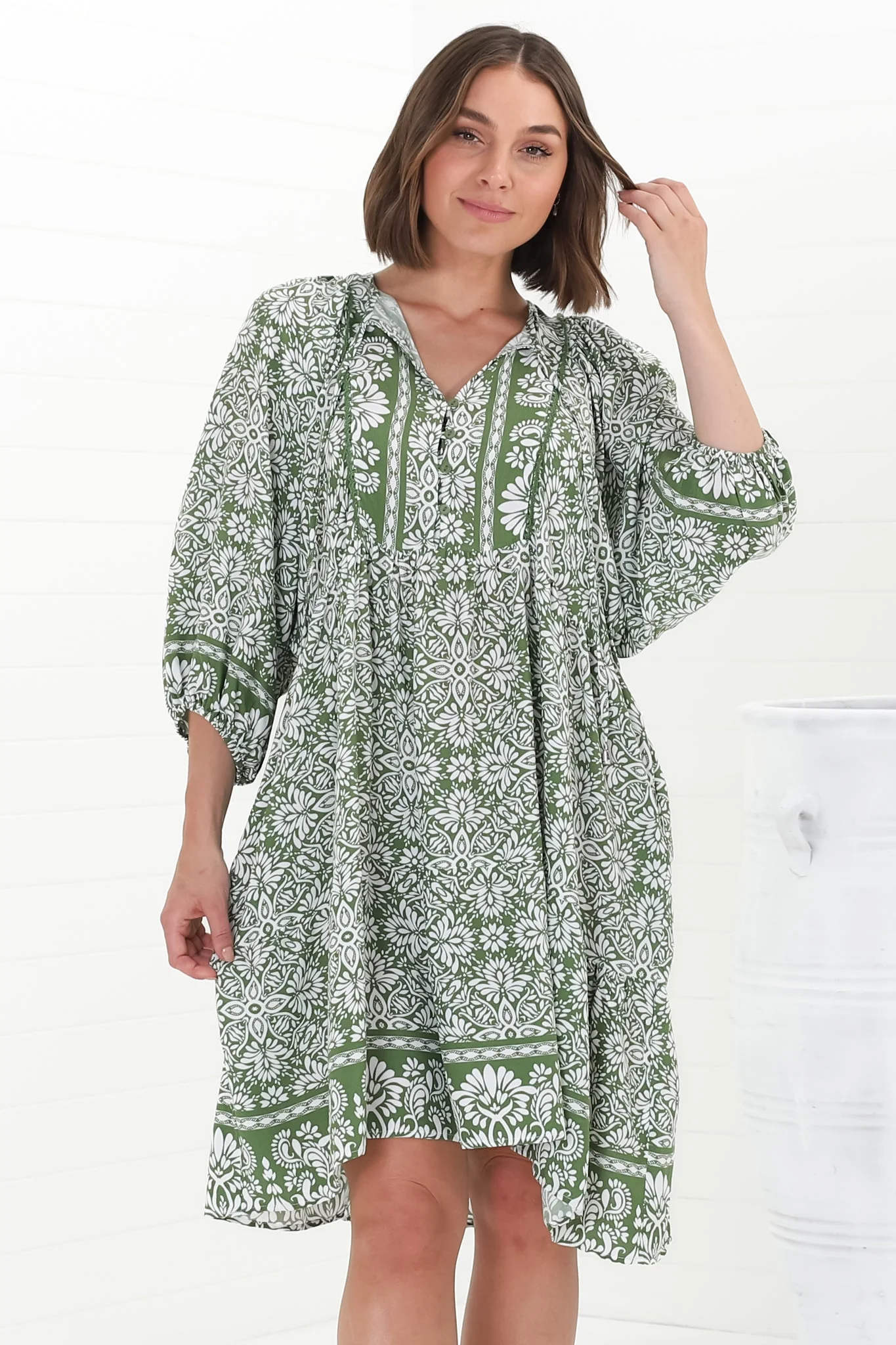Juddy Mini Dress - Batwing Sleeve Smock Dress with Lace Detailing in Harley Print Green