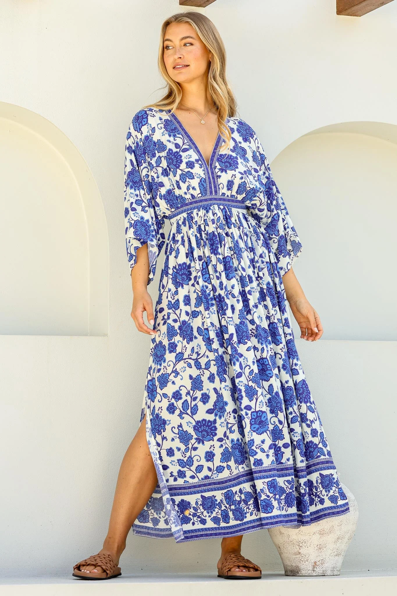 Zelle Maxi Dress - V Neck Batwing Sleeve Dress with Side Splits in Kailin Print Blue